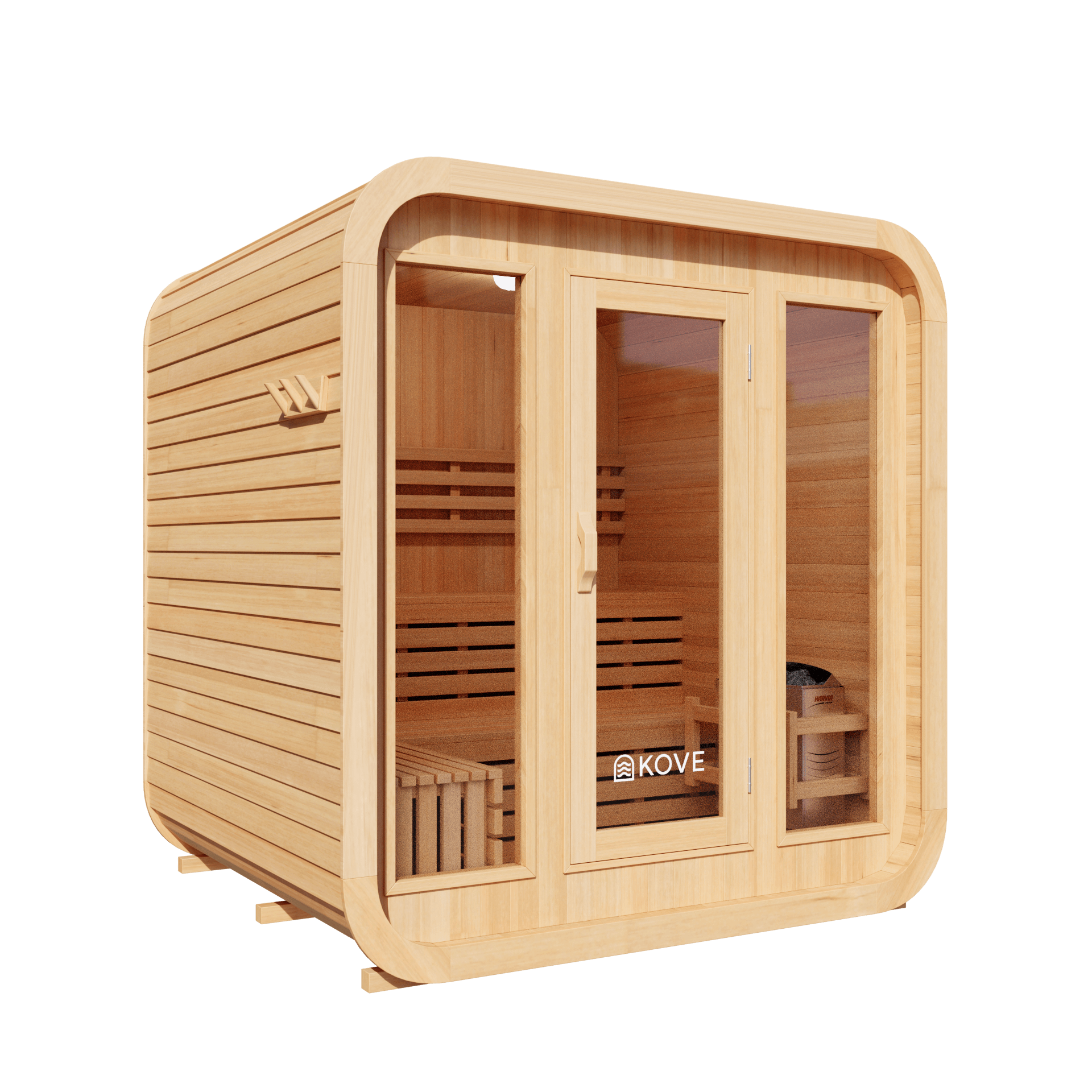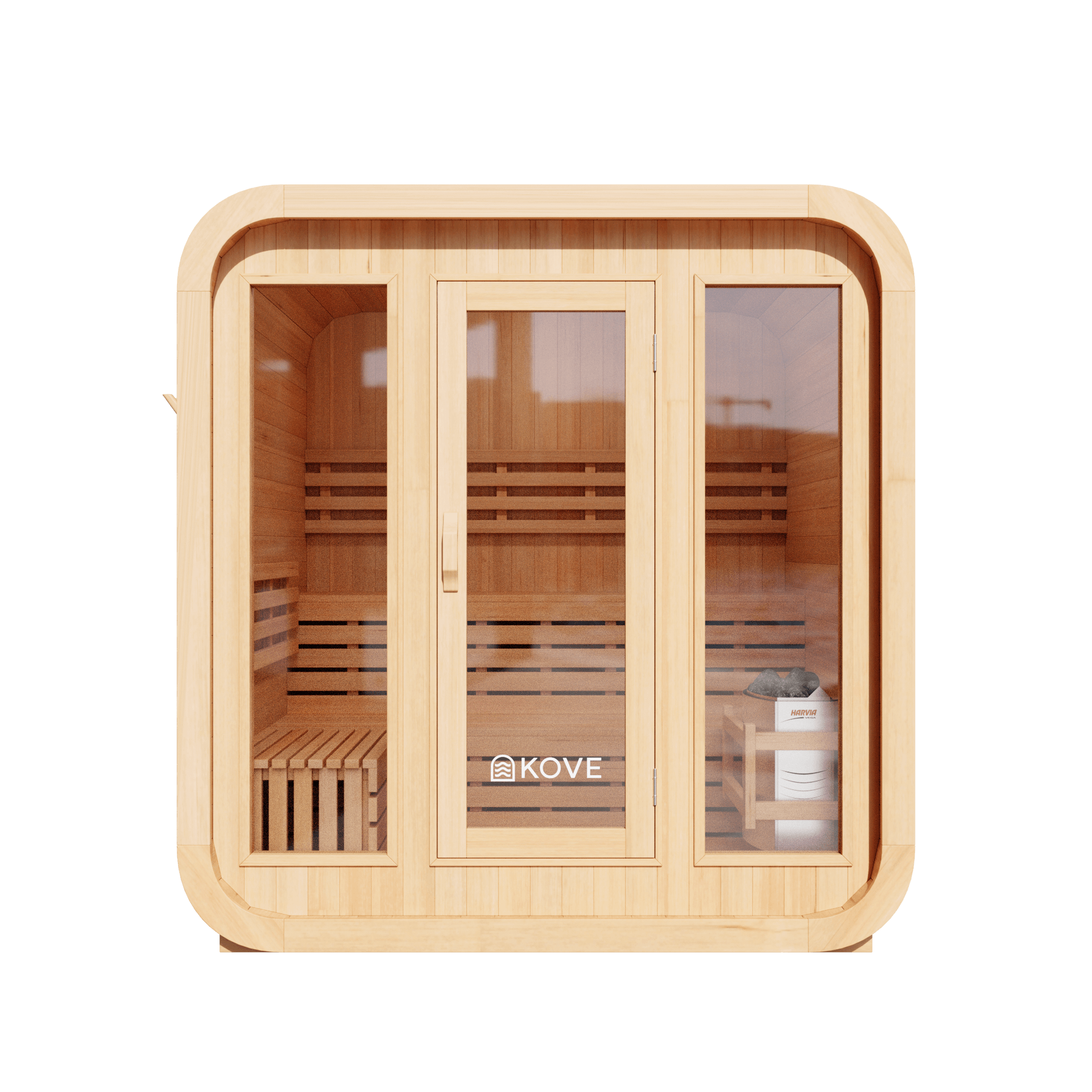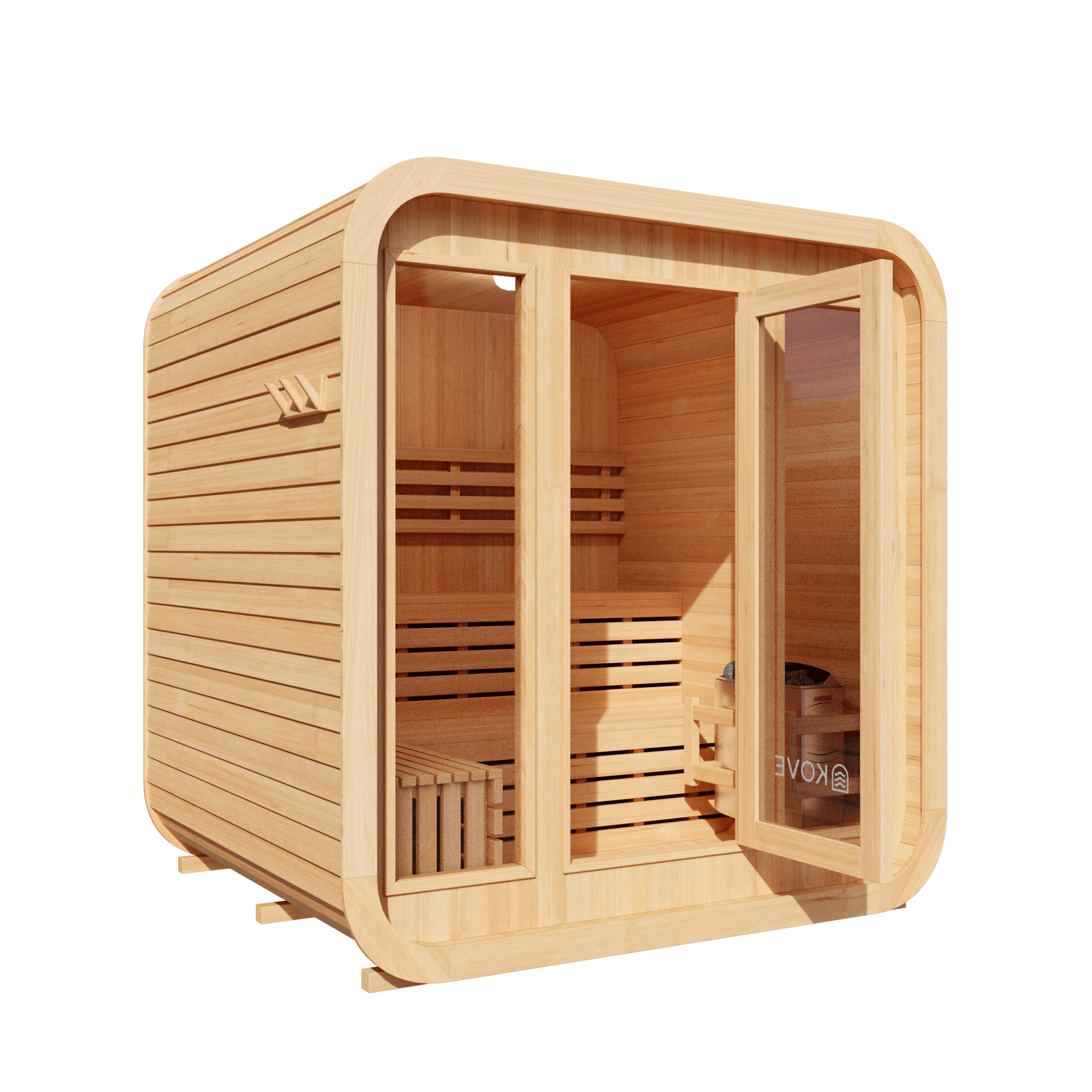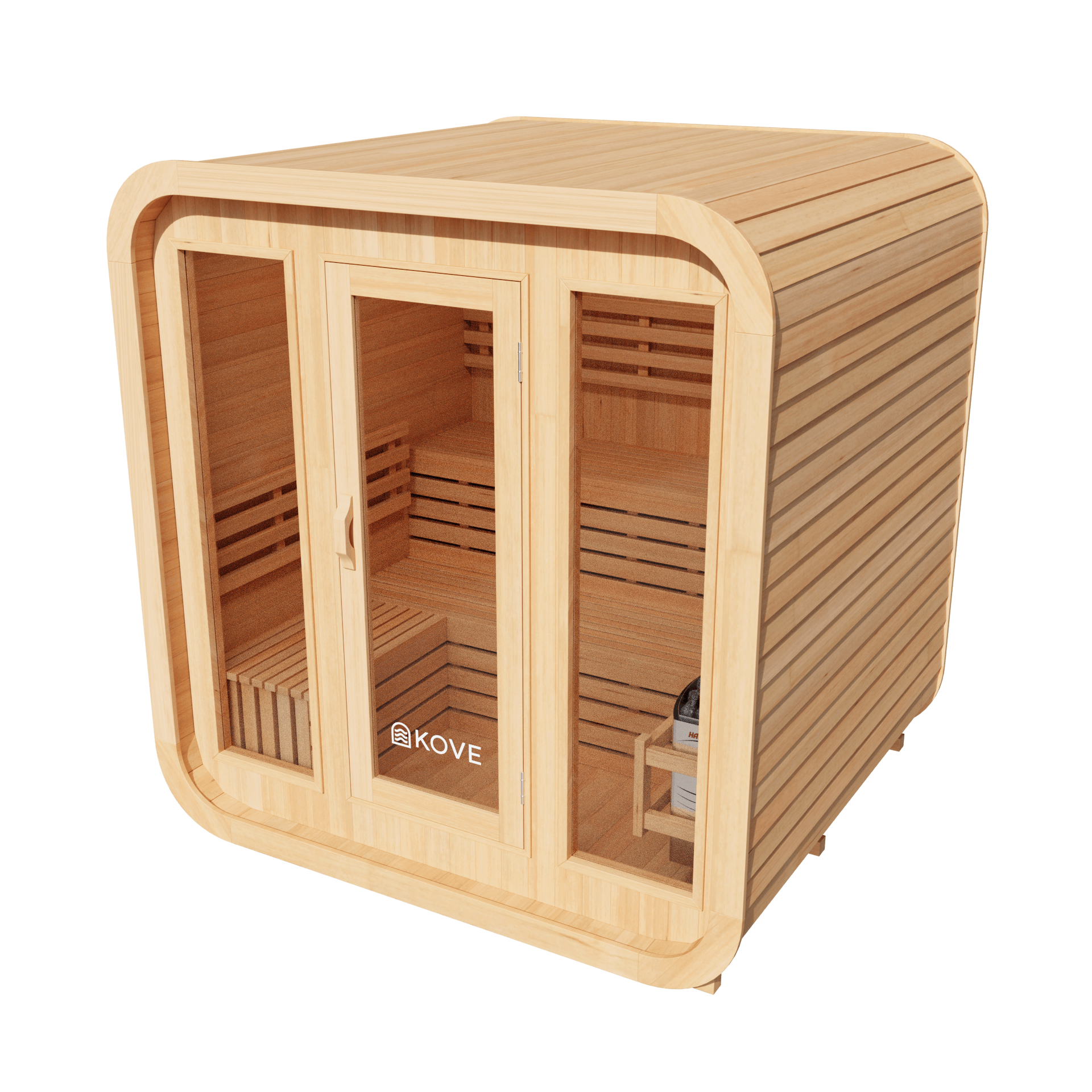 - Heater: 6kW KOVE electric sauna heater (6kW Harvia upgrade available)