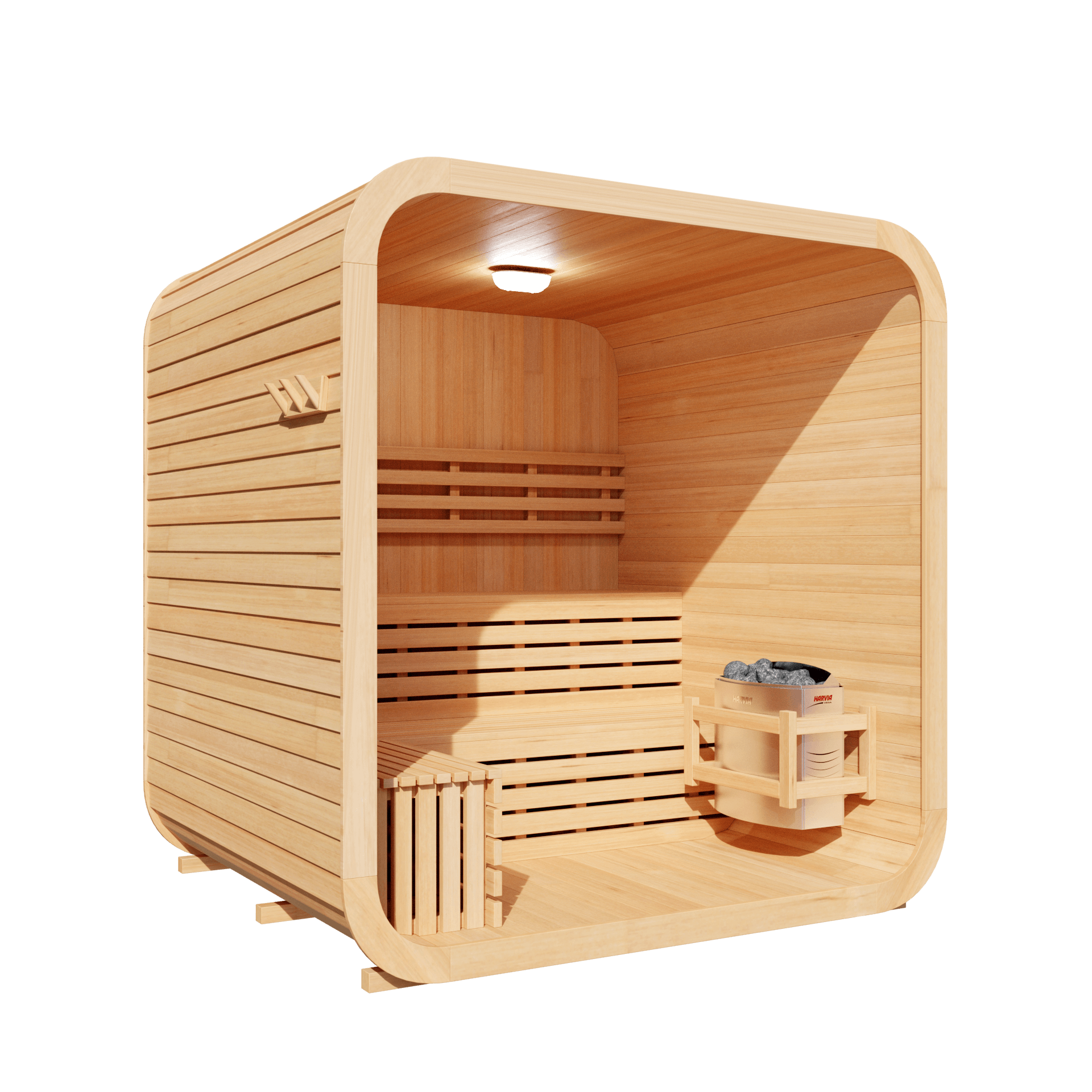- Design: Cube-style outdoor sauna (no porch, no banding)